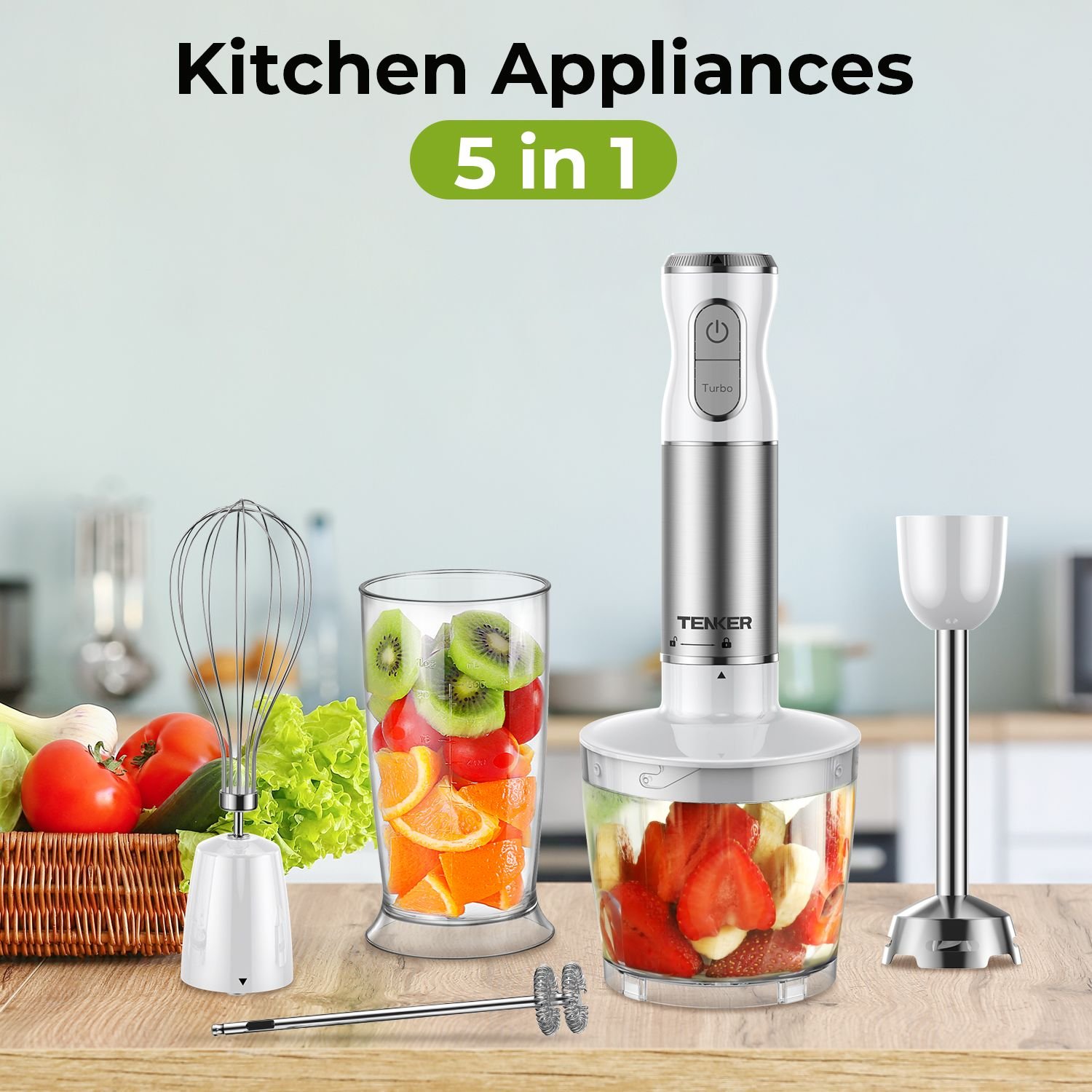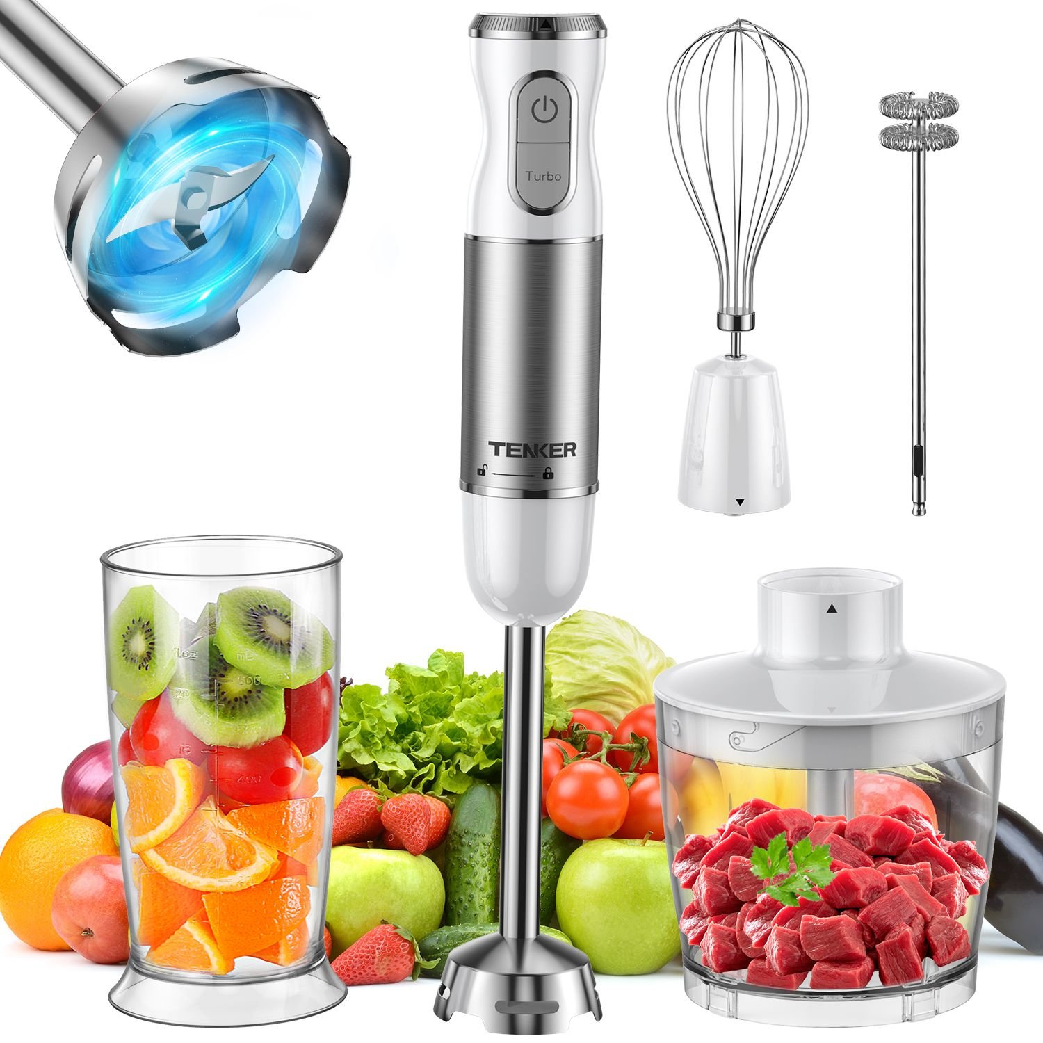 3.5-in-1 Multi-Purpose: Versatile handheld stick blender, 600ml mixing beaker, 500ml food chopper, egg whisk and milk frother meet your various needs for mixing, chopping, egg-beating, puree and preparing baby food. The 360° safety lock and one-click installation make removal and cleaning so easy.