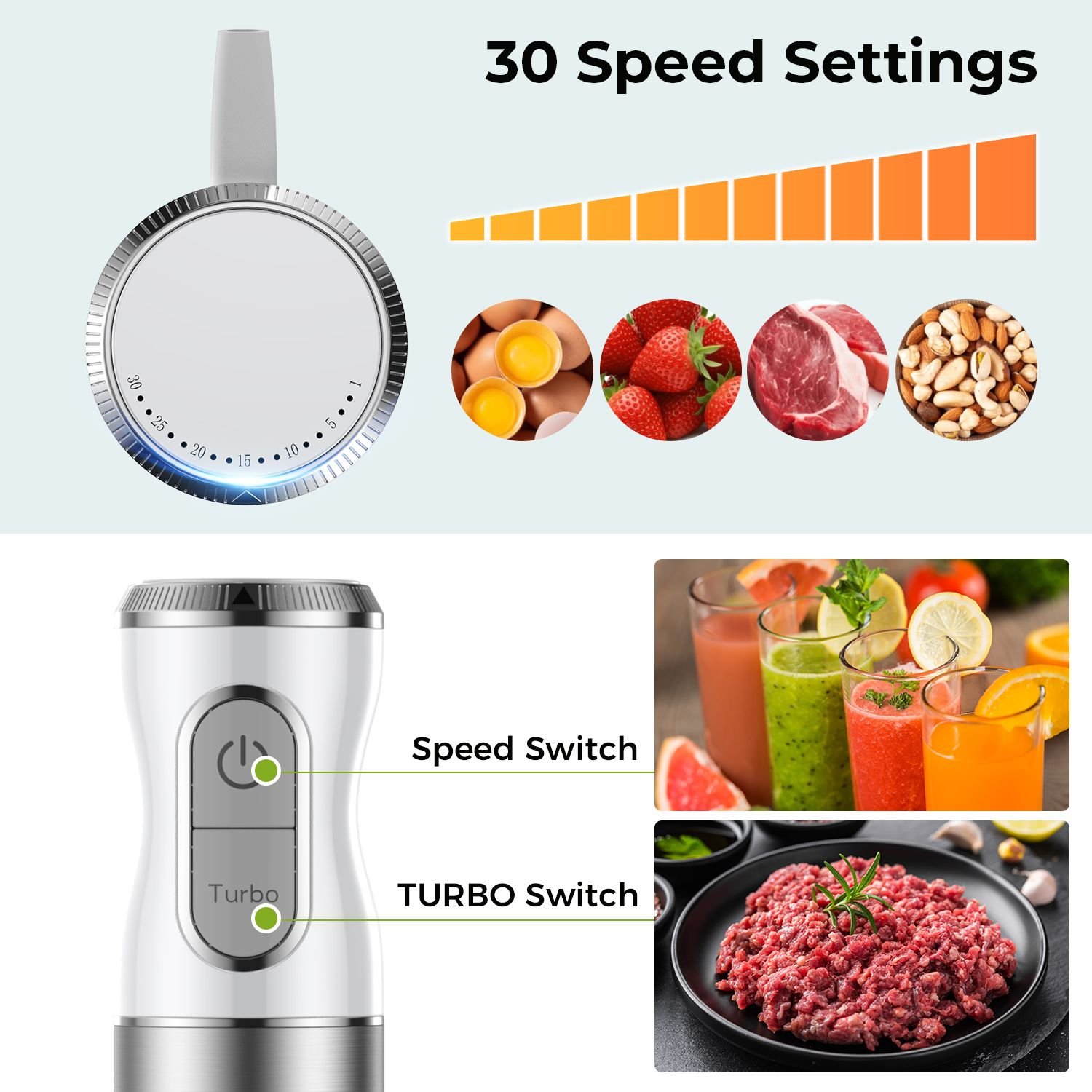 2.Limitless Power: Chop, puree and mix all ingredients to perfection in a flash with heavy-duty immersion hand blender copper motor. 30-speed/Turbo blending presets give you max control over your cooking.