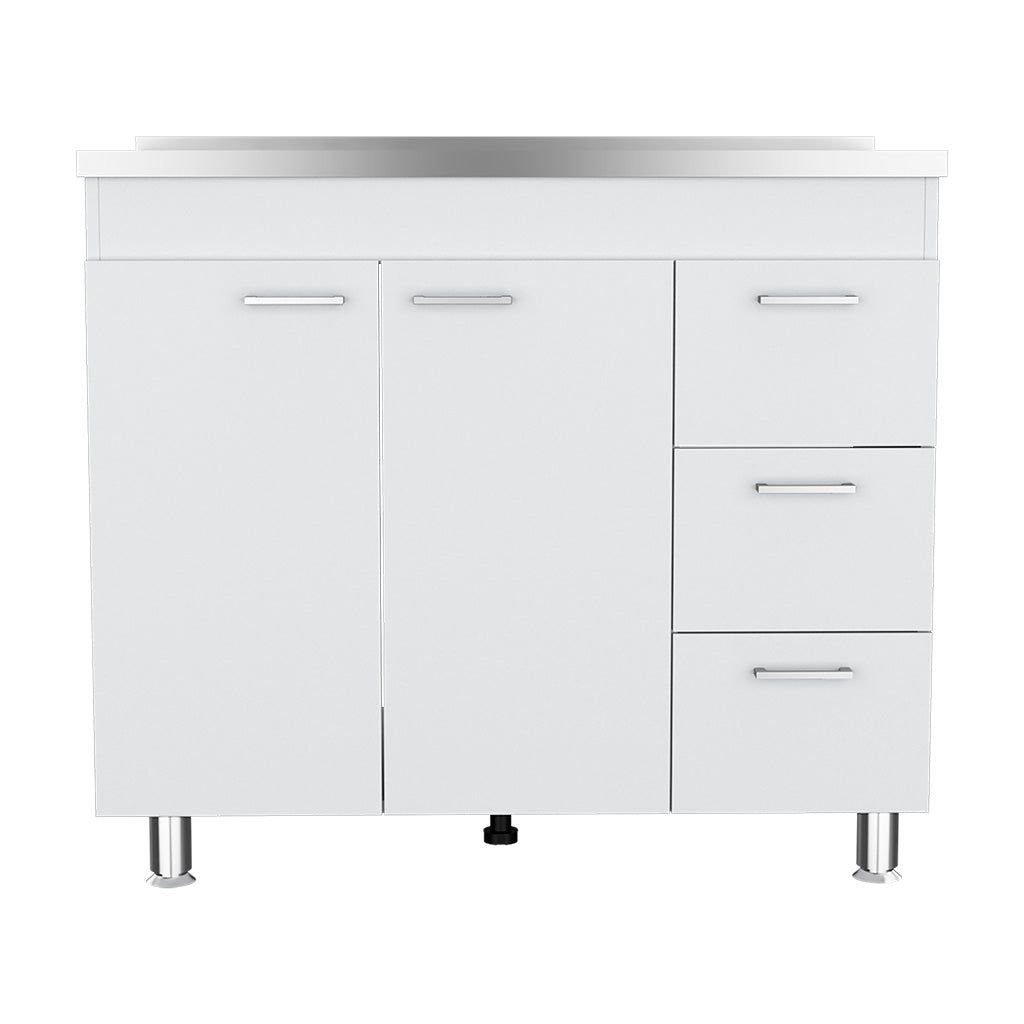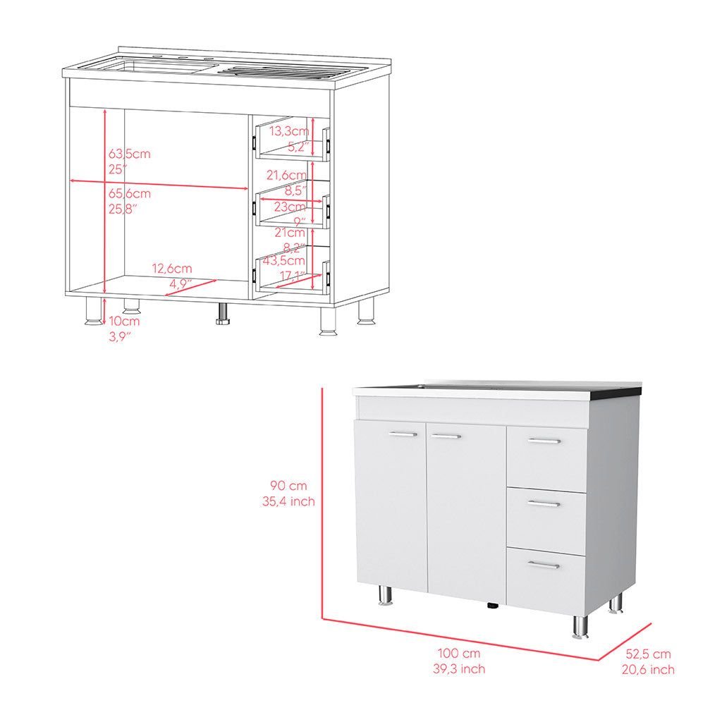 The Kisco Utility Sink is perfect for your kitchen! The large aluminum countertop (20,67"D X 39,37"W) is great for preparing food or washing dishes, and the large double-door cabinet with internal storage provides plenty of room to store your kitchen items. Additionally, the three drawers on the front of the cabinet are perfect for keeping your utensils and other tools organized and easy to access. ***FAUCET NOT INCLUDED*** Designed with elegant White manufactured wood finish.Dimensions:Height: 35.43' Width: 39.37 ' Depth: 20.67'Furniture Type: Ready to assemble (full assembly required).Certifications: CARB phase II compliant – TSCA Title VI Compliant. Warranty: 1-year warranty coverage in wooden parts- 1-year warranty coverage in hardware pieces since its manufacturing date is found in the lot number printed in the product box.Shipment details: Free shipping to the 48 contiguous states - delivery time: Between 2 and 5 days depending on the customer's location- season- and weather factors. Other details: This product does not include decorative or background elements; Check that the box is in good condition- and well packed- and check with the help of the manual that the corresponding parts have been included; For more warranty information- shipment details- cancellations- returns & replacement parts go to the bottom section of our website to learn more; Installation & Assembly Instructions included.
