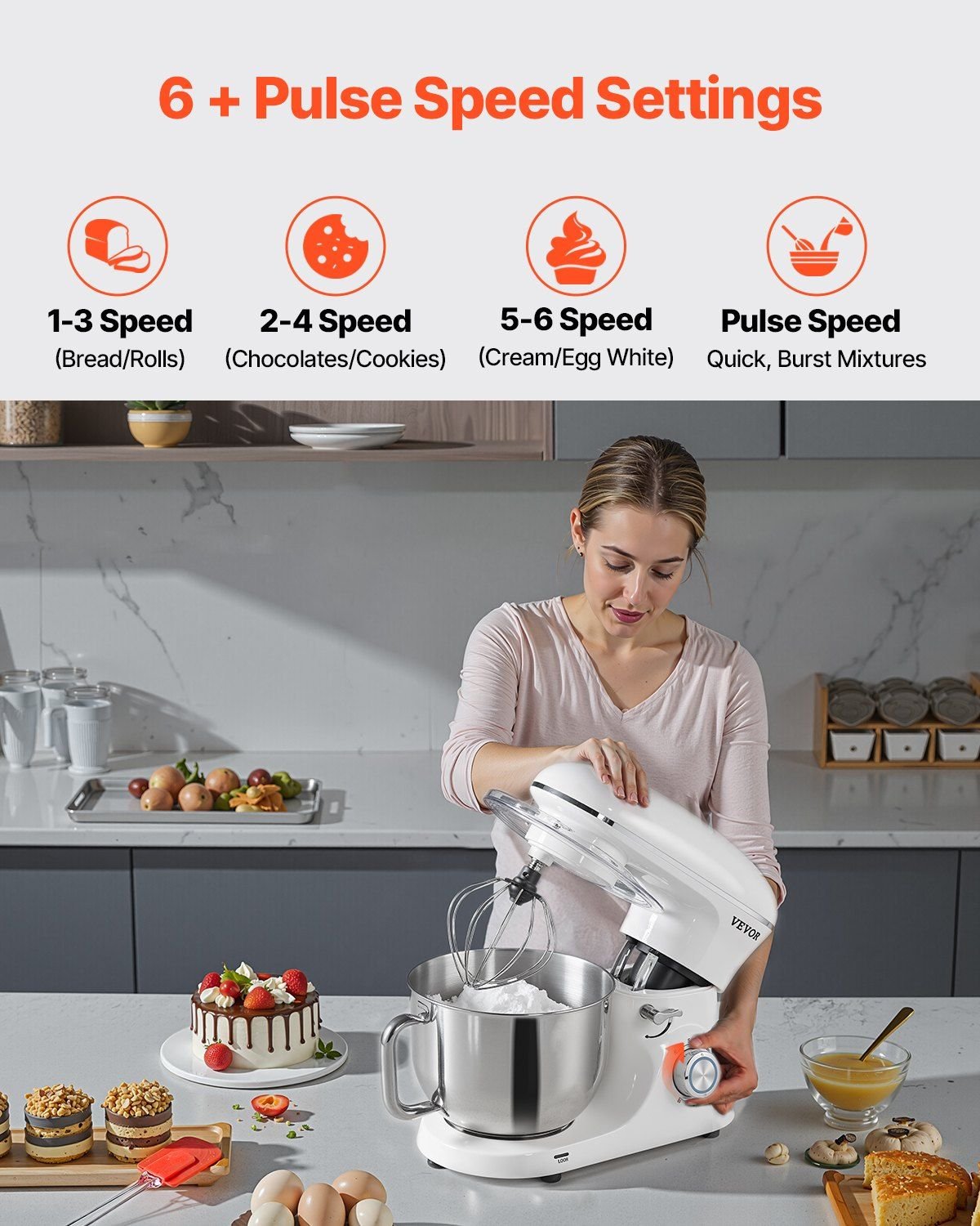2.High-performance Mixing: Our electric food mixer comes with a powerful motor and a worm gear drive for quick and uniform mixing. Choose from 6 adjustable speeds and a pulse setting to get your desired result every time. Use speeds 1-3 for dough, 2-4 for fillings, and 5-6 for whipping cream. Note: Always stop the machine before changing speed.